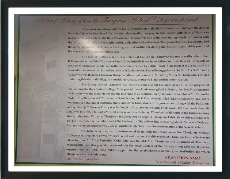 The idea of starting a full-fledged Medical College in Thanjavur became a reality when Shri. K. Kamaraj was the Chief Minister of Tamil Nadu. Initially it was intended to start this college in the vicinity of the Raja Mirasudhar Hospital (in the place now occupied by public library, State Bank of India etc.,) and the foundation stone was laid by the President of India Rajendra Prasad being garlanded by Shri. A. Y. S. Parisutha Nadar who was then the Chairman Thanjavur Municipality and also the sitting M.L.A. of Thanjavur.