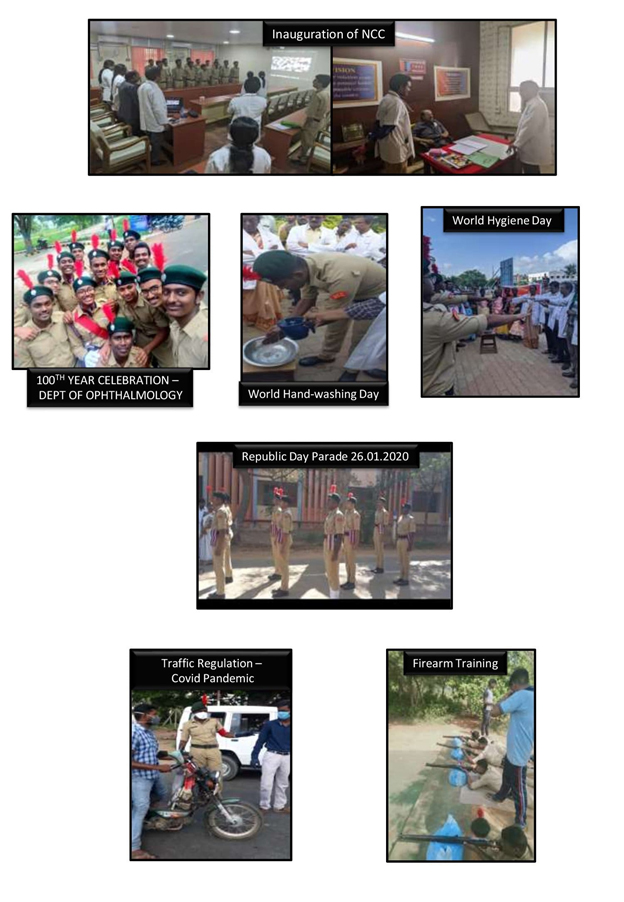 The students of Thanjavur Medical College are part of India's largest youth volunteering organization. The rebirth of NCC in this prestigious institution was in August 2019. The journey started with 17 CADETS and caretaker Dr. Gopinath (Assistant Professor of General Surgery) and currently with a strength of 34 CADETS, 34 (TN) INDEP COY NCC, THANJAVUR. The students are trained in various disciplines. The cadets though not involved in combat they are trained to excel both physically and mentally by different levels of camps.